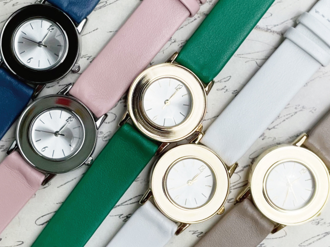 牛革の型押しデザインや、シンプルなカラーベルトの時計プランです。ストック色はそのときどきで様々な種類をご用意しています。ご希望色がある場合はお早めにお問ください