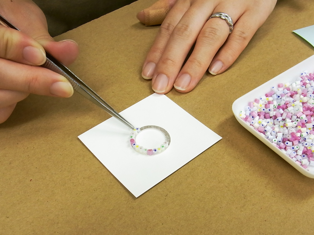 ただし、ミルフィオリ(ガラス粒)が2〜3ミリと小さいので、老眼鏡をご使用の方はお持ちください。スタジオでも拡大鏡を用意していますが、ご自分にあったものが見やすいかと思います。