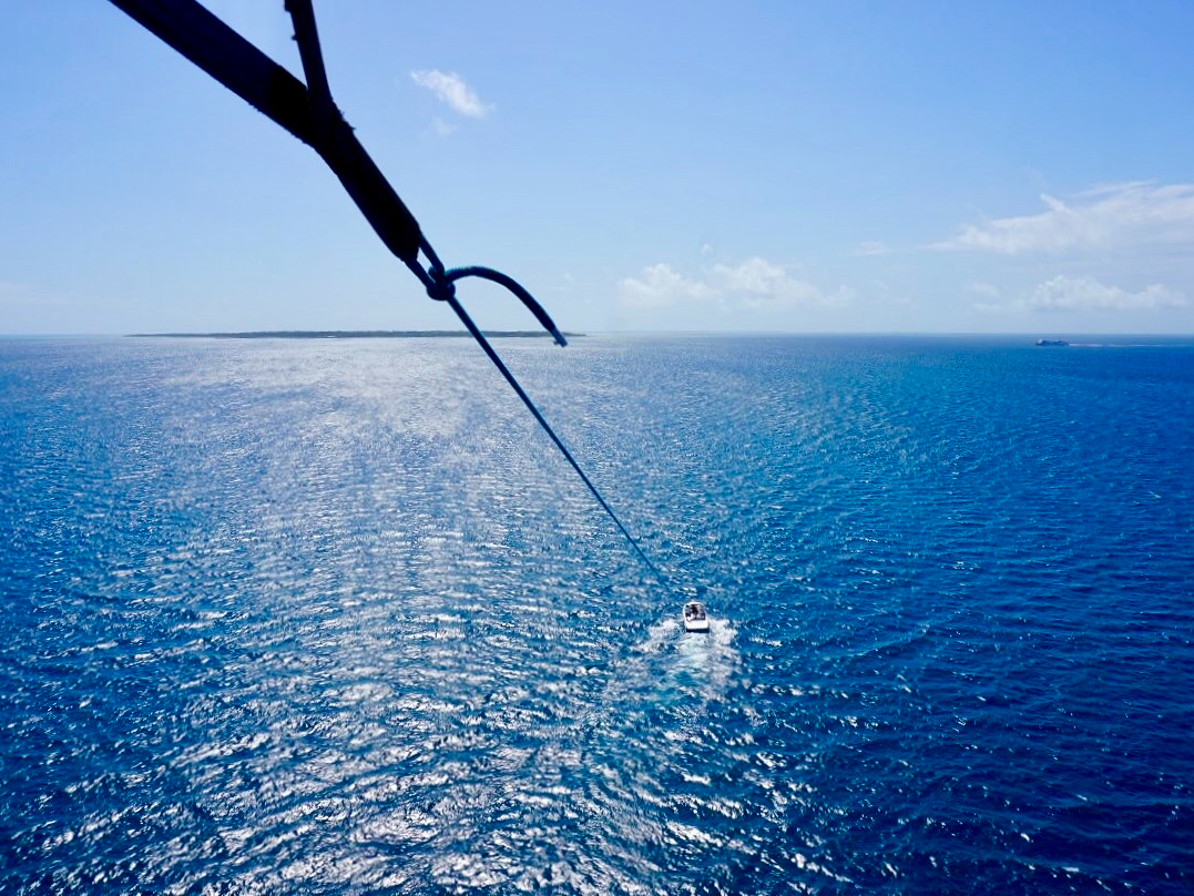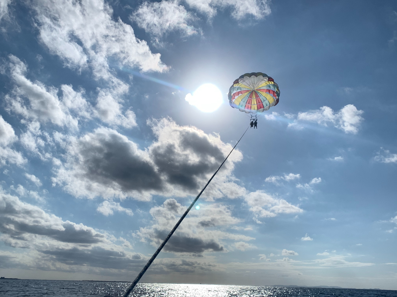 パラシュートを身に着け、船につながれたロープで引っ張られ、風を受けグングンと上昇し空中を浮遊するマリンアクティビティです。