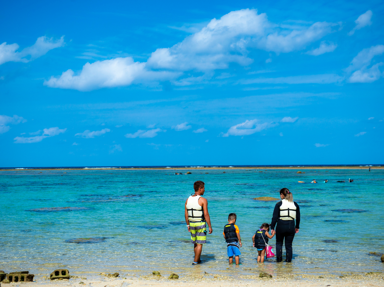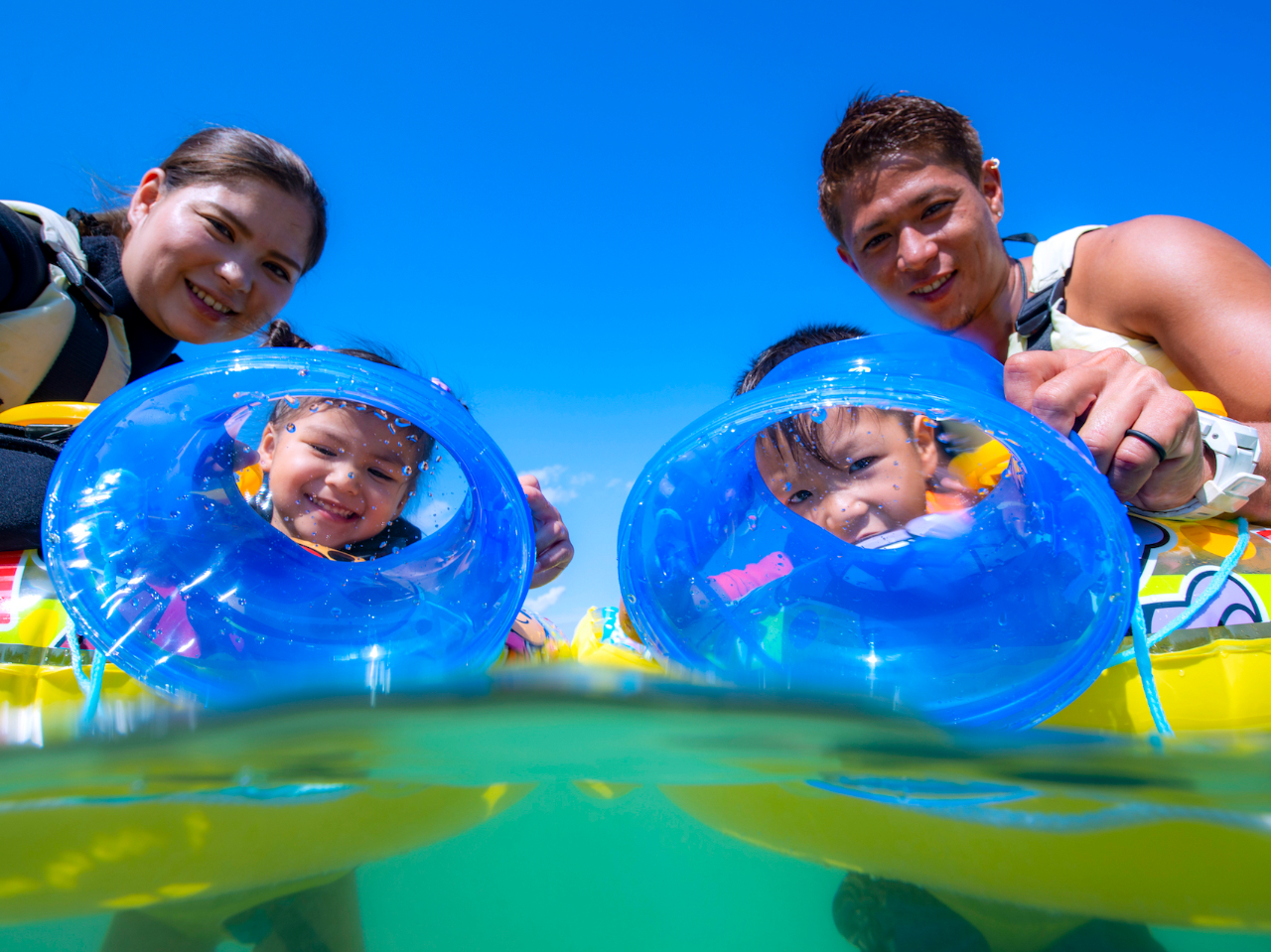 沖縄屈指のリゾートエリア「恩納村」の天然ビーチで海あそびやシュノーケルを楽しむコースです。小さなお子様も足が着く浅瀬でしっかり練習してからエントリーするので安心。水に顔をつけるのが苦手なお子様は、箱メガネ越しに海中を覗くことも可能です。エサをあげれば、沢山のお魚が寄ってきます。初めてのシュノーケルの方や海に不安がある方におすすめのプランです。
