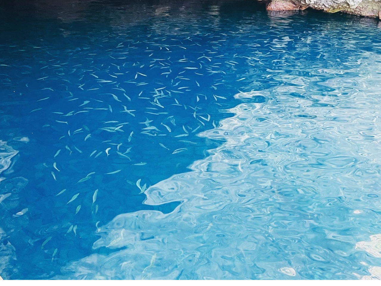 青の洞窟の前には、イワシの群れが頻繁に群れています。カヤックの底から、魚ウオッチングが楽しめます。