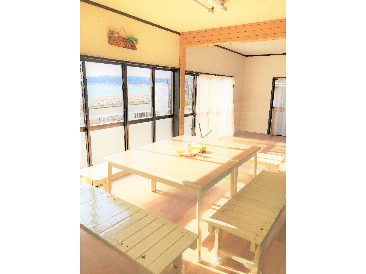 クラブハウス2階の海が一望できるバルコニーとフリースペースでは別途カフェメニューもご注文いただけますので体験後にゆっくり海を楽しんでいただくことも可能です