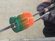 ガラス棒をバーナーで溶かし柔らかくなったところで、金属の棒に巻きつけ形や色を整えます。