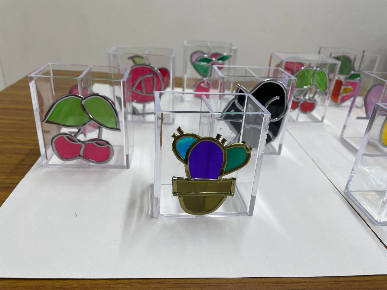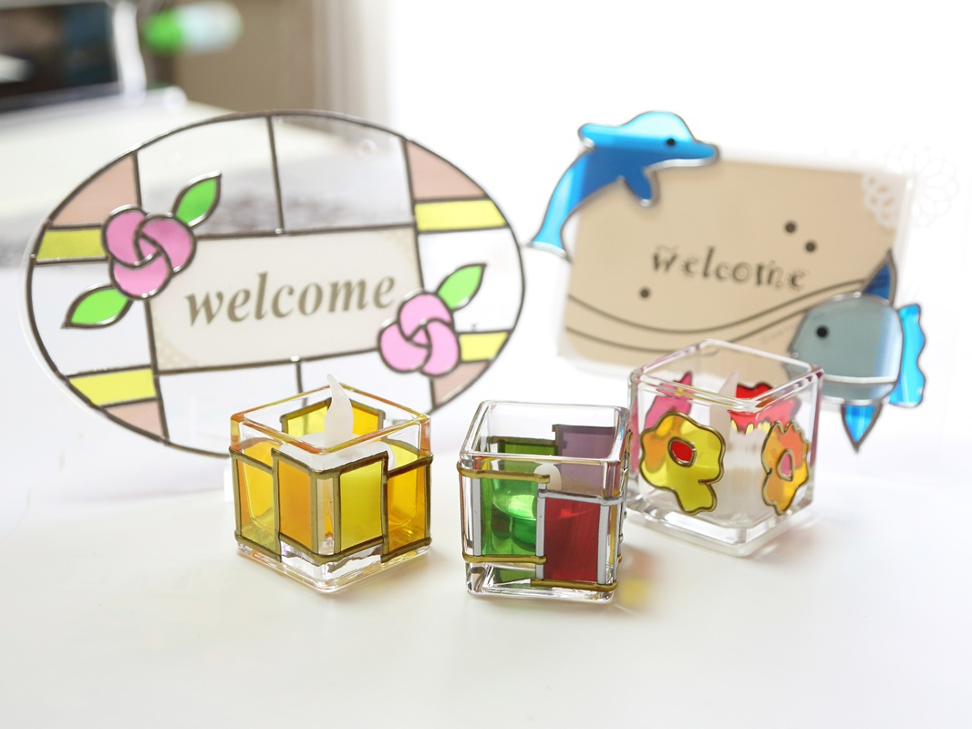 グラスに好きなカラーフイルムを張り付けてステンドグラス風に作成することができました。とても気軽で楽しめました。出来上がったグラスを出窓に飾ると、キラキラと日光を受けてカラーフィルムに透明感が出てとても素敵ですよ。キャンドルグラスや小物入れにしようかと考えています。丁寧に教えてくださりありがとうございました。