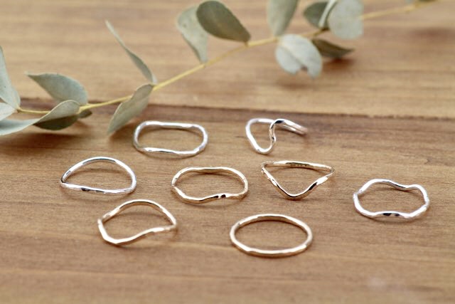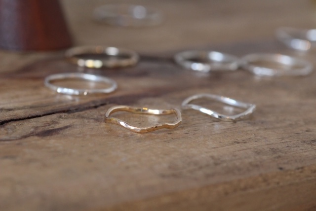 錆びにくい(黒くなりにくい)アルデンティウムシルバーやk14GFの素材を曲げたり伸ばしたり、叩いたりしながらリングの形を作っていきます。