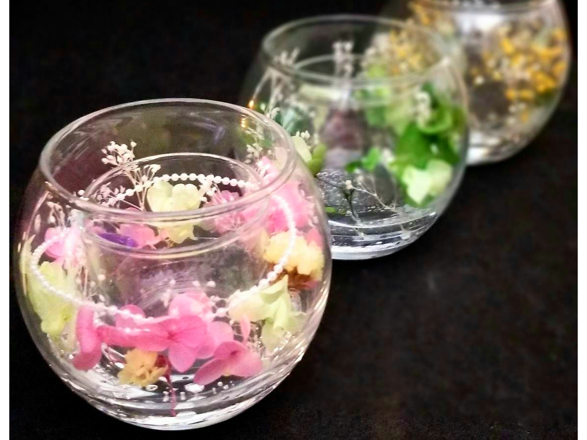 まるでお水に生けているようにお花で彩ったキャンドルホルダー。