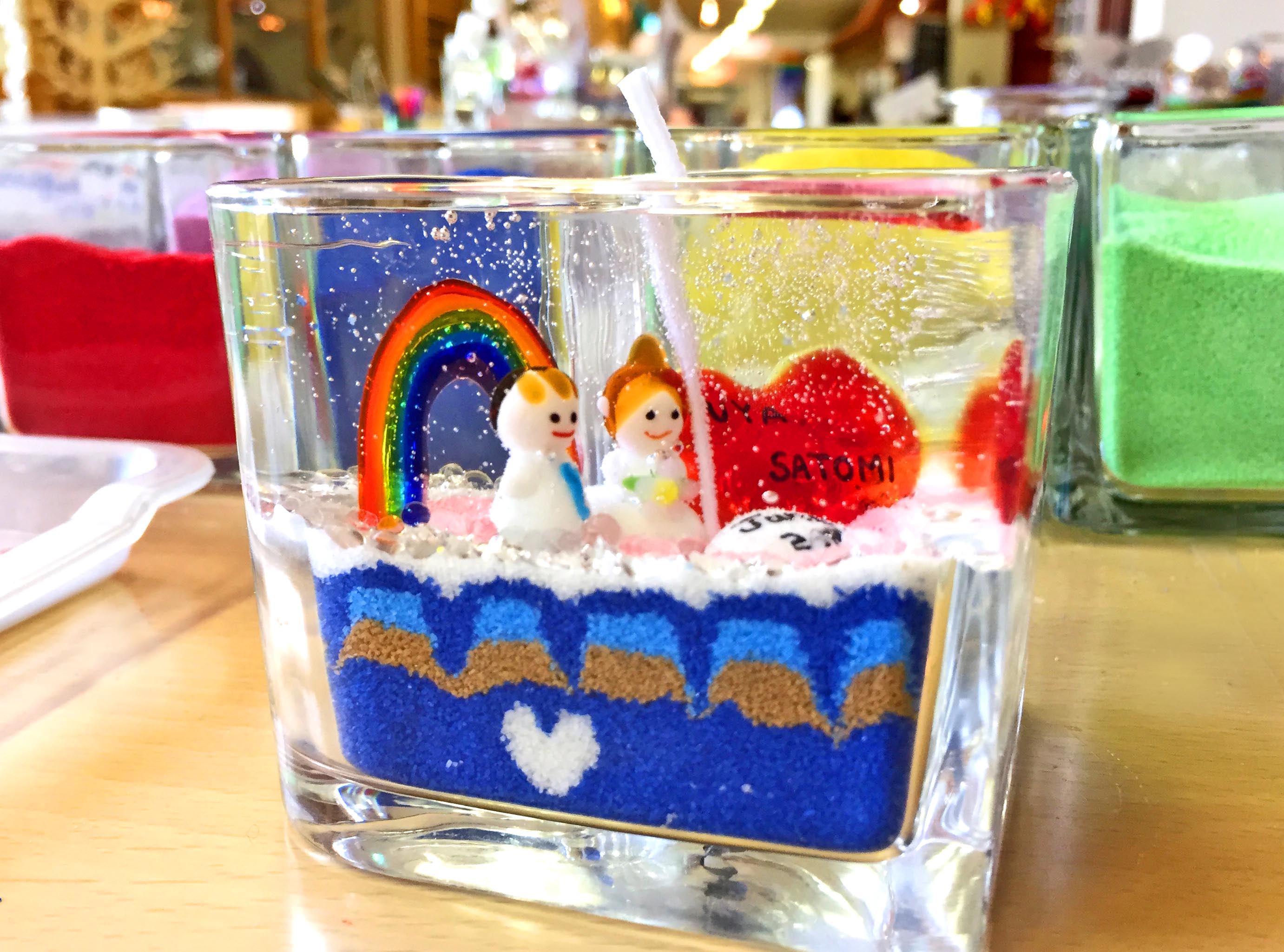 | 料金に含まれるもの | 砂、ビー玉、貝殻、石は使い放題!最後に流し入れる香りつきのジェルキャンドルも料金内です。 グラスもサイズの他、形も卵やハートなどかわいい形の中からお選びいただけます。 |
