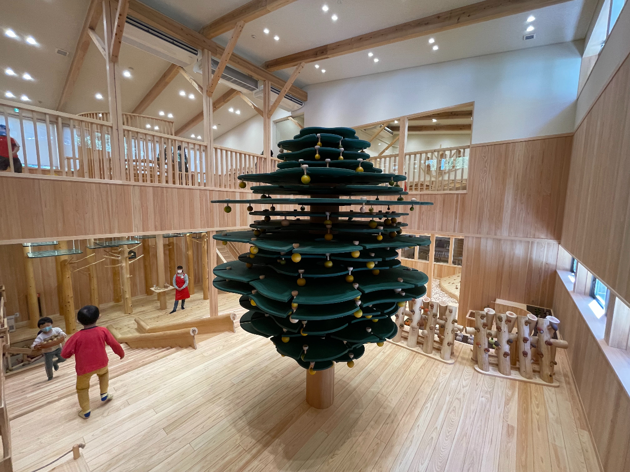 スタート・ゴール地点の森のおもちゃ美術館には、木でできた山や畑、すべり台やログハウス、木のボールプールなど、ワクワクする遊具やおもちゃがいっぱい!