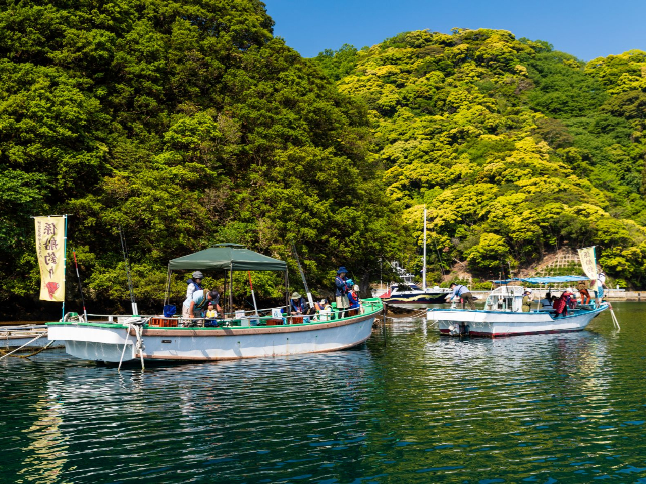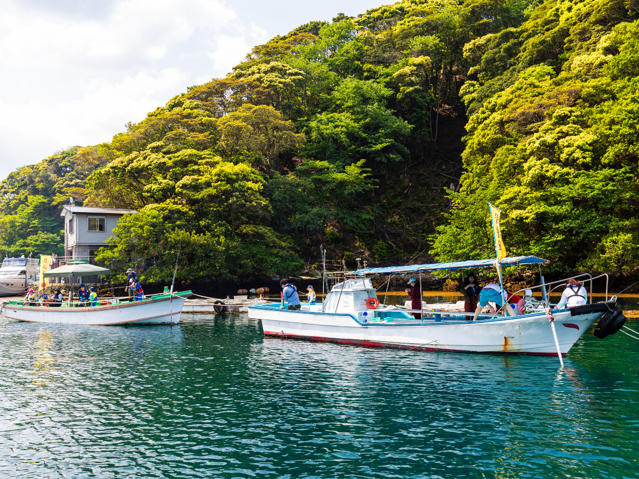 一年を通じて穏やかな安良里港内に2隻の係留船があります。係留船までは漁協前岸壁から渡船を致します。(約3分)