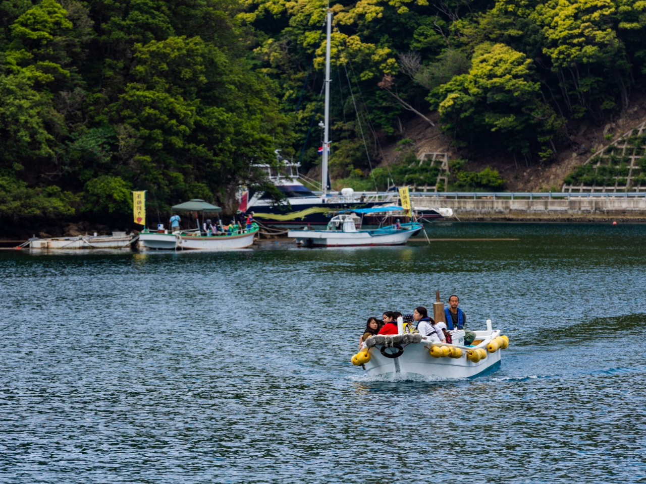 一年を通じて穏やかな安良里港内に2隻の係留船があります。係留船までは漁協前岸壁から渡船を致します。(約3分)