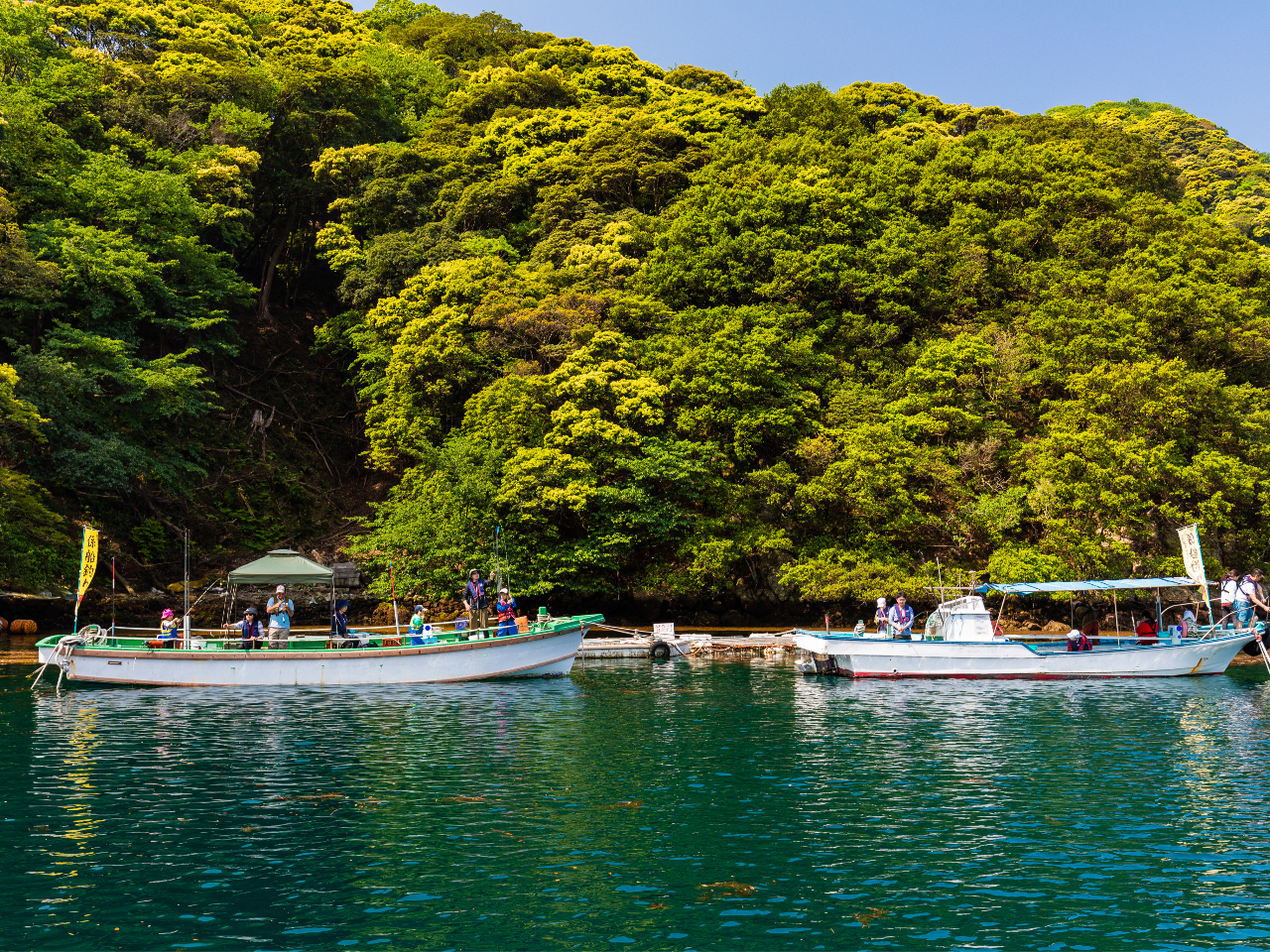 一年を通じて穏やかな安良里港内に2隻の係留船があります。係留船までは漁協前岸壁から渡船を致します。(約3分)