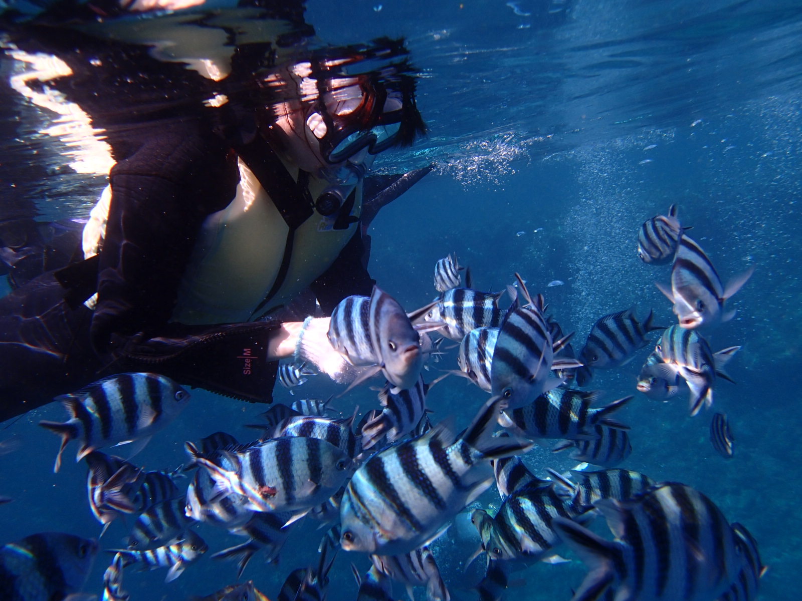 プカプカ海の上を浮いて移動するので、のんびり・ゆったり沖縄の海をお楽しみいただけます。海の中に差し込む太陽のカーテンはとってもキレイ・・・さらに青の洞窟では、雑誌で見た以上の神秘的な光景がご覧いただけます。時間帯や季節によって水面の色が変わるのも自然ならでは。きっと沖縄旅行のステキな思い出になるはず。他にも、お子様達に大人気な「お魚への餌付け」では目の前を覆い尽くす程たくさんの魚達が集まってくるので、間近で生き物たちと触れ合えるのも、魅力的♪中にはご飯と間違って、指をパクパクしてくる魚ちゃん達も(笑)