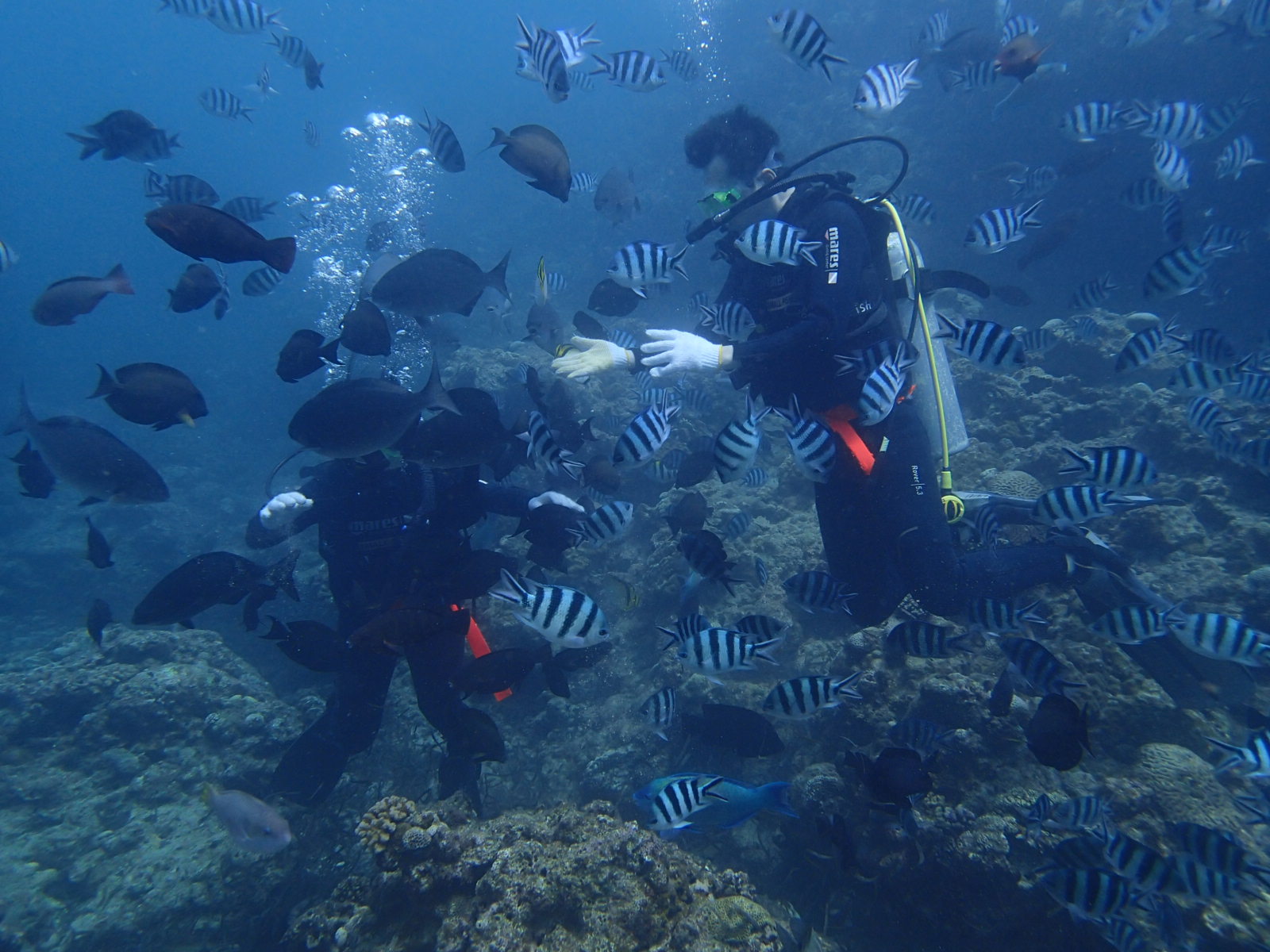 まずは陸上でダイビングについての注意事項をお話します。説明が終わったら、いざ海へ!女性のお客様、年配のお客様、お子様の重たいタンクはスタッフが海に入るまで運ぶので、移動も楽チン♪そして、足の立つ浅瀬で水面練習をして、いよいよ海の中へ!目の前に広がるサンゴ礁や色とりどりの魚達を楽しみながらゆっくりと青の洞窟を目指します。50分以上の潜水時間と最大深度10mで本格的なダイビングが体感できます。お魚への餌付けでは目の前を埋め尽くす魚の群れに大興奮間違いなし!