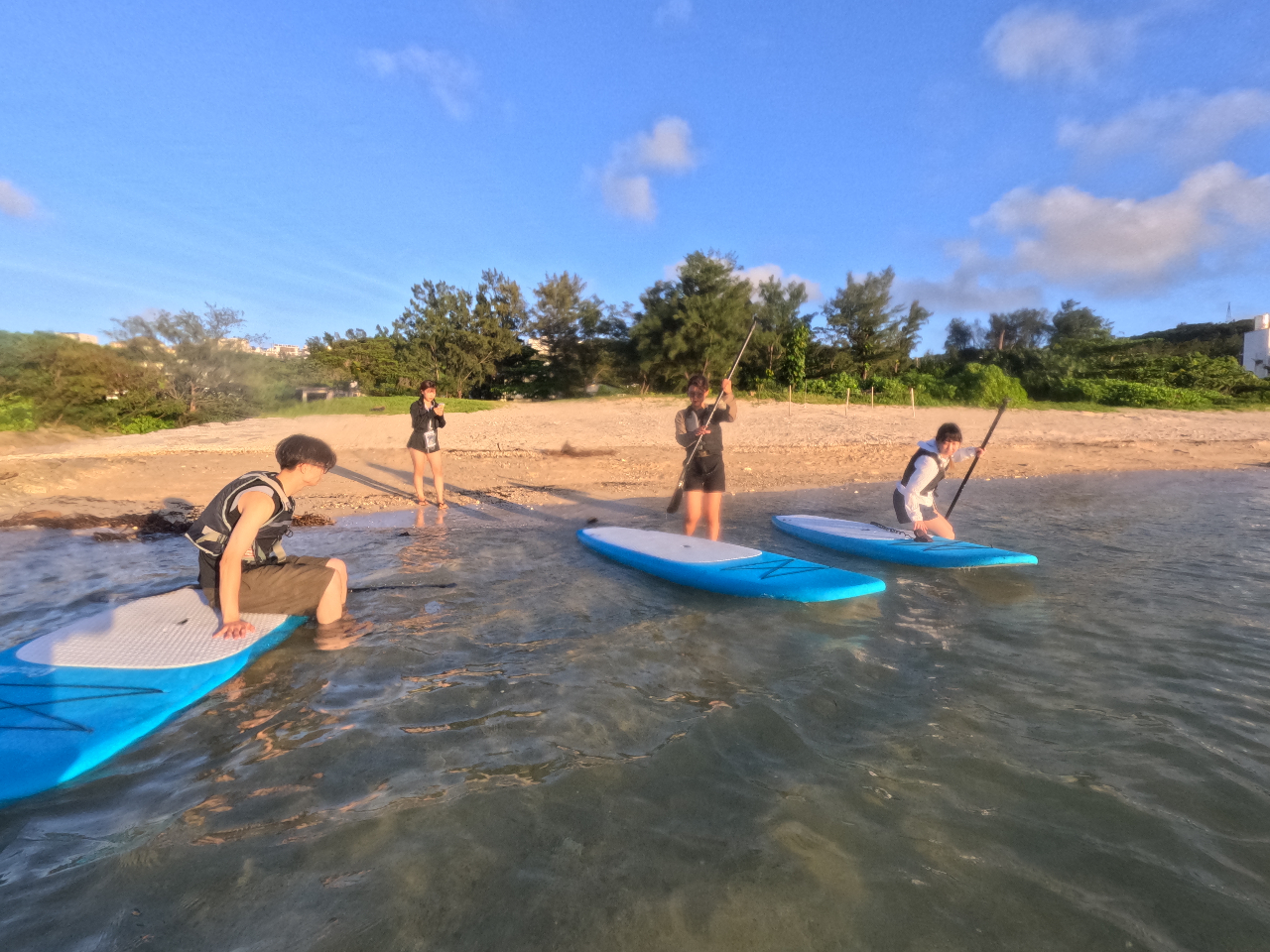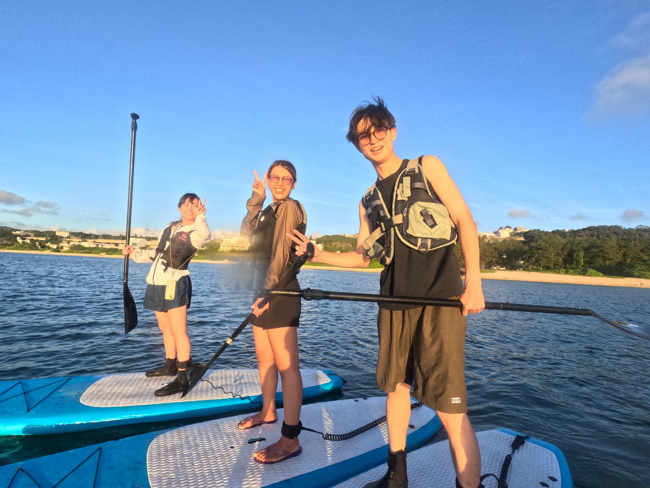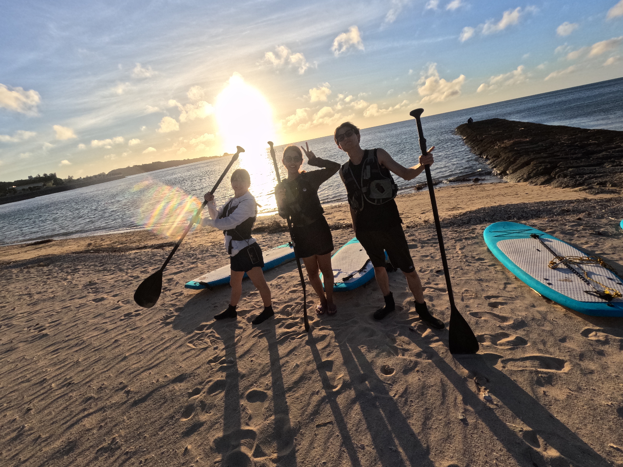 真栄田岬をバックに夕日のきれいに見えるビーチでのんびりサップ。そこでの「サンセットラウサップ」とは、サンセット(夕日)を見ながらのラウ(リラックス)とサップを楽しむアクティビティのことです。