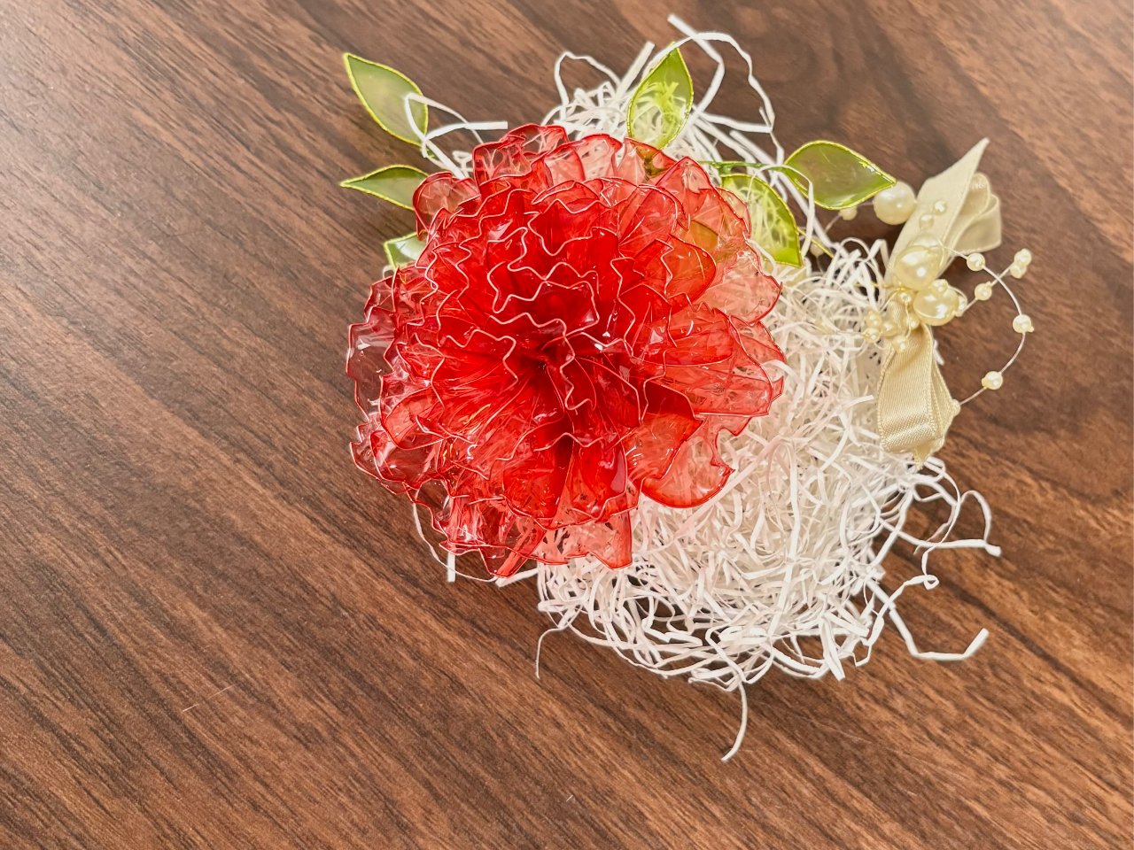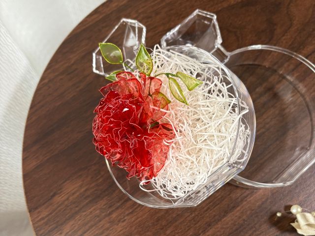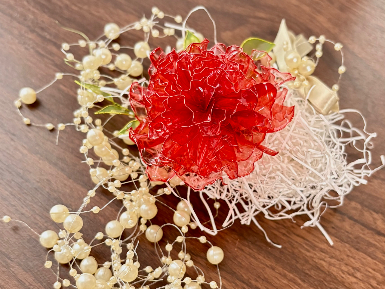 「赤いカーネーション」を手作りでプレゼントはいかがですか?グリーンの小さな葉もディップアートで作ります。香水瓶の形をした透明度の高いプラスチックケースに、リボンをつけてそのままプレゼントにできます。