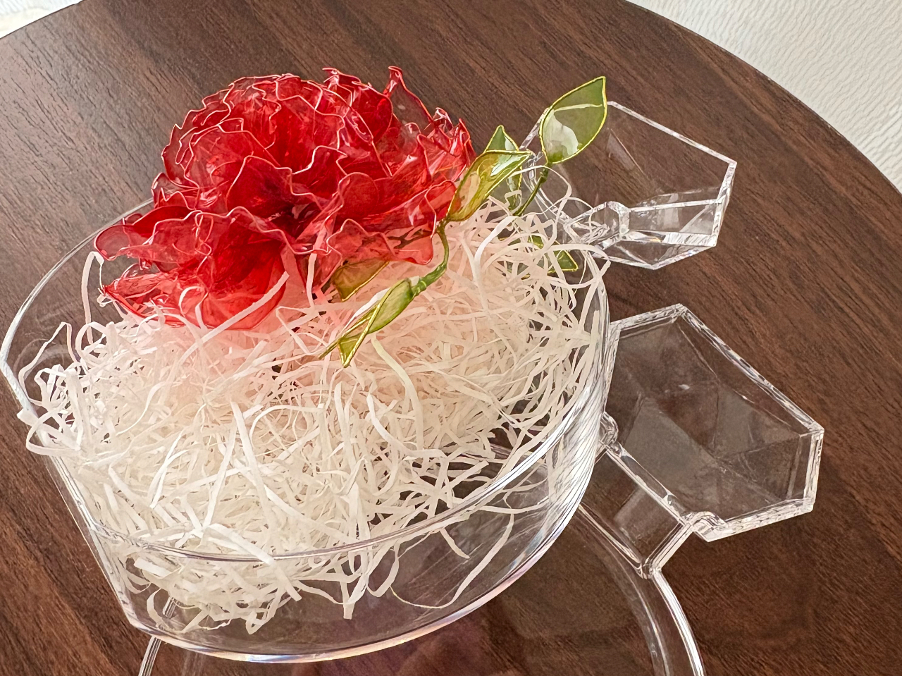 ディップアート(アメリカンフラワー)は、細いワイヤーで作った枠を、専用の樹脂液に入れてすくい上げると、パッと膜が張り、その膜は自然乾燥で3〜4分で乾きます。こうしてできた花びらを組み合わせて作ります。