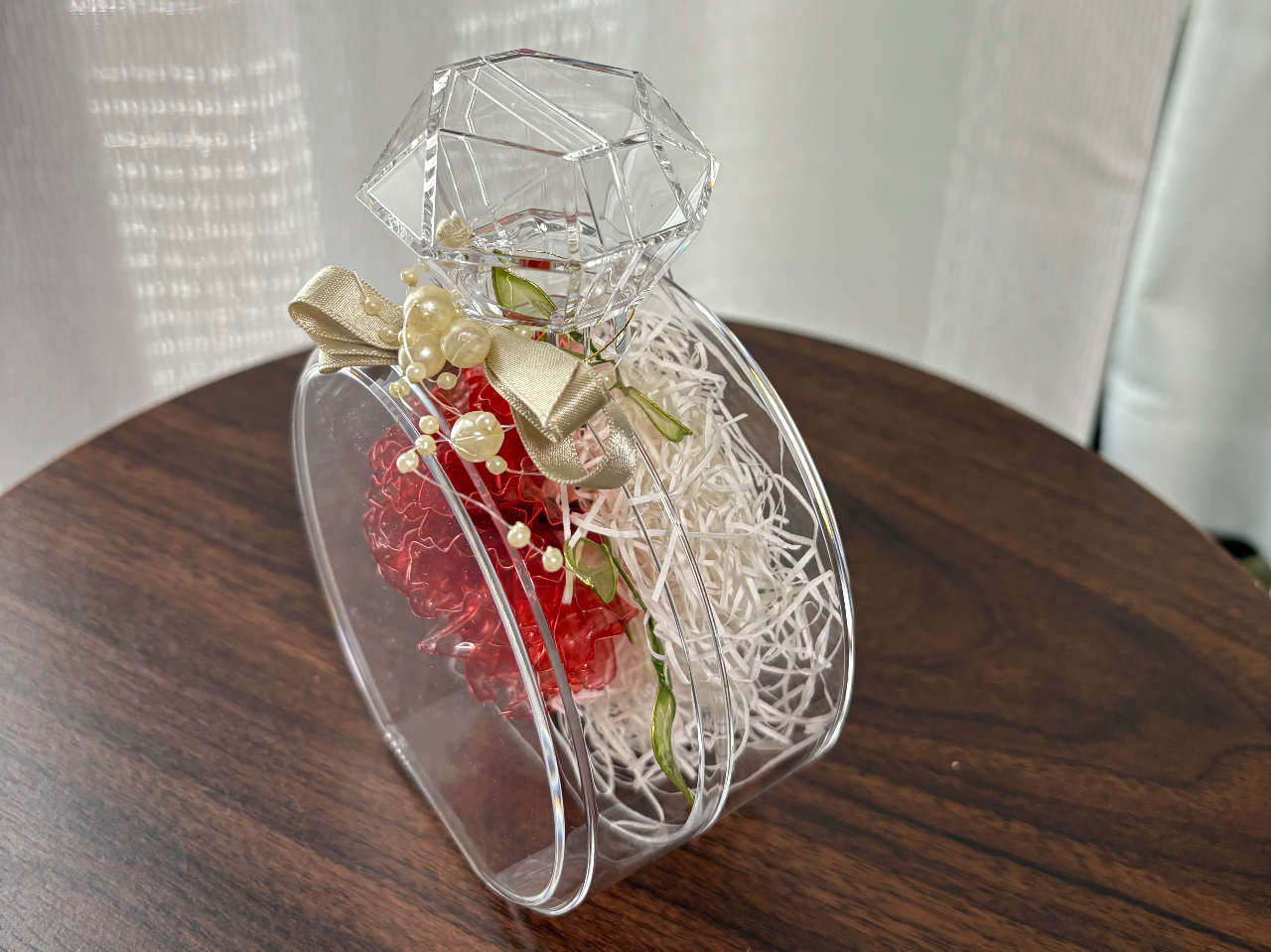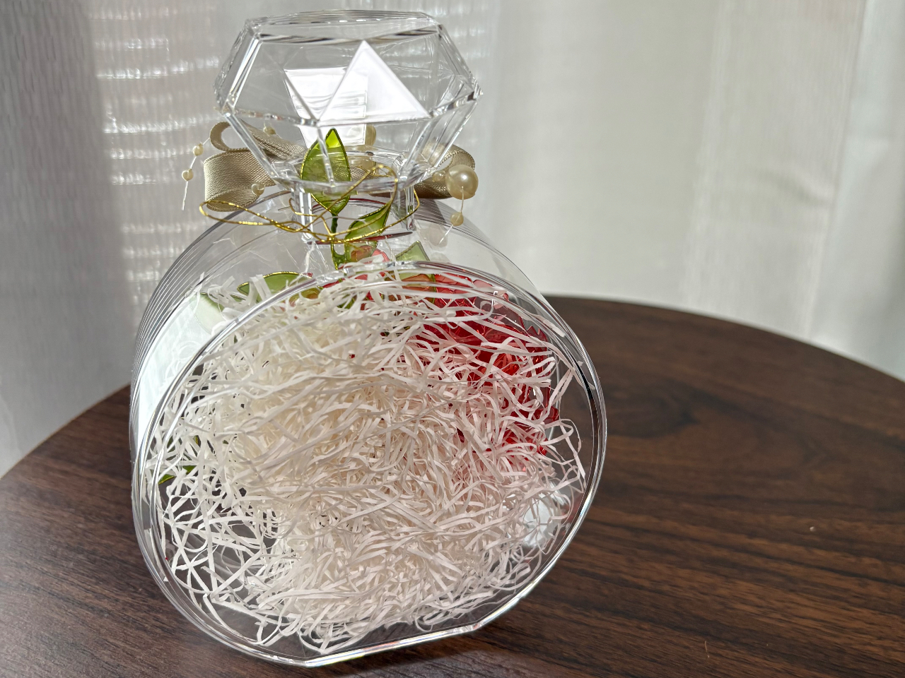 ボックスフラワー 透明度の高いプラスチックケースは、お洒落な香水瓶の形。そのままプレゼントに。 |