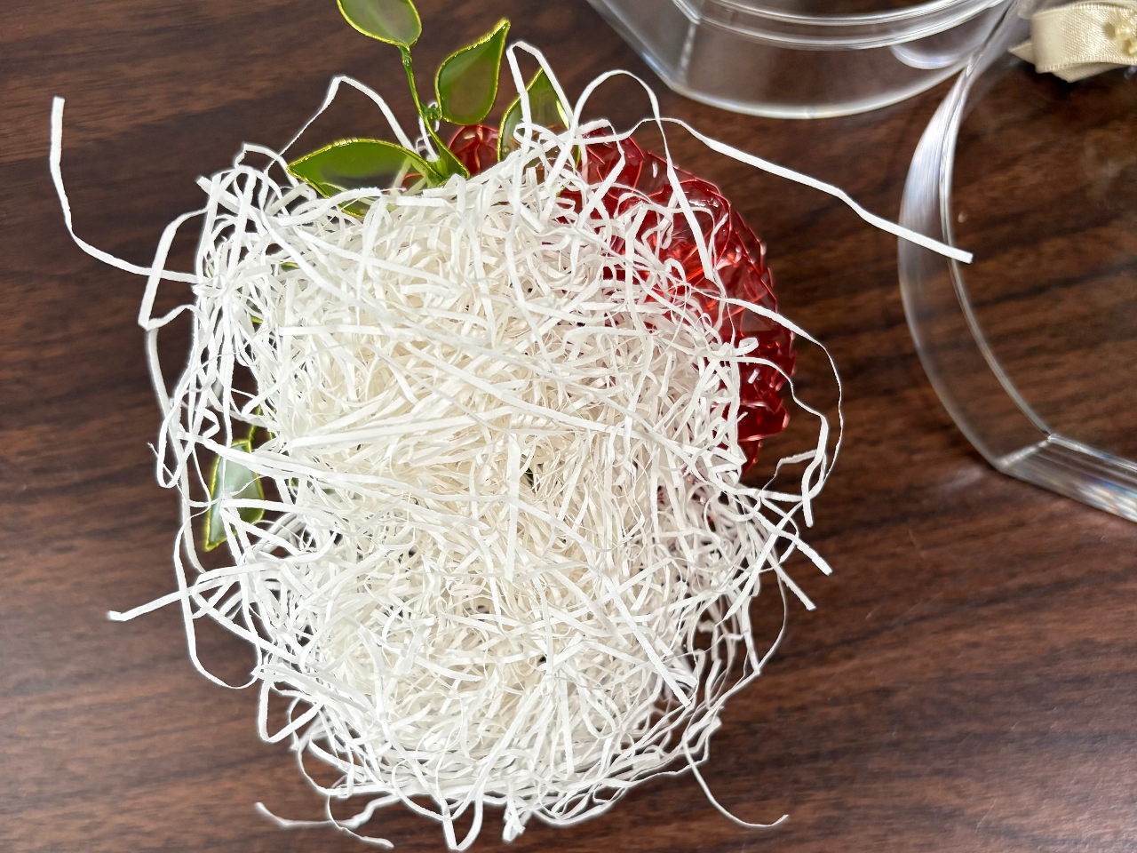 ケースに紙パッキンなどを入れ、お花と葉を飾り付けたら完成です。