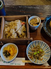きせつのおこわと、通常のおこわ、煮物、お味噌汁、お漬物、デザートにわらびが付いているセットで1500円です