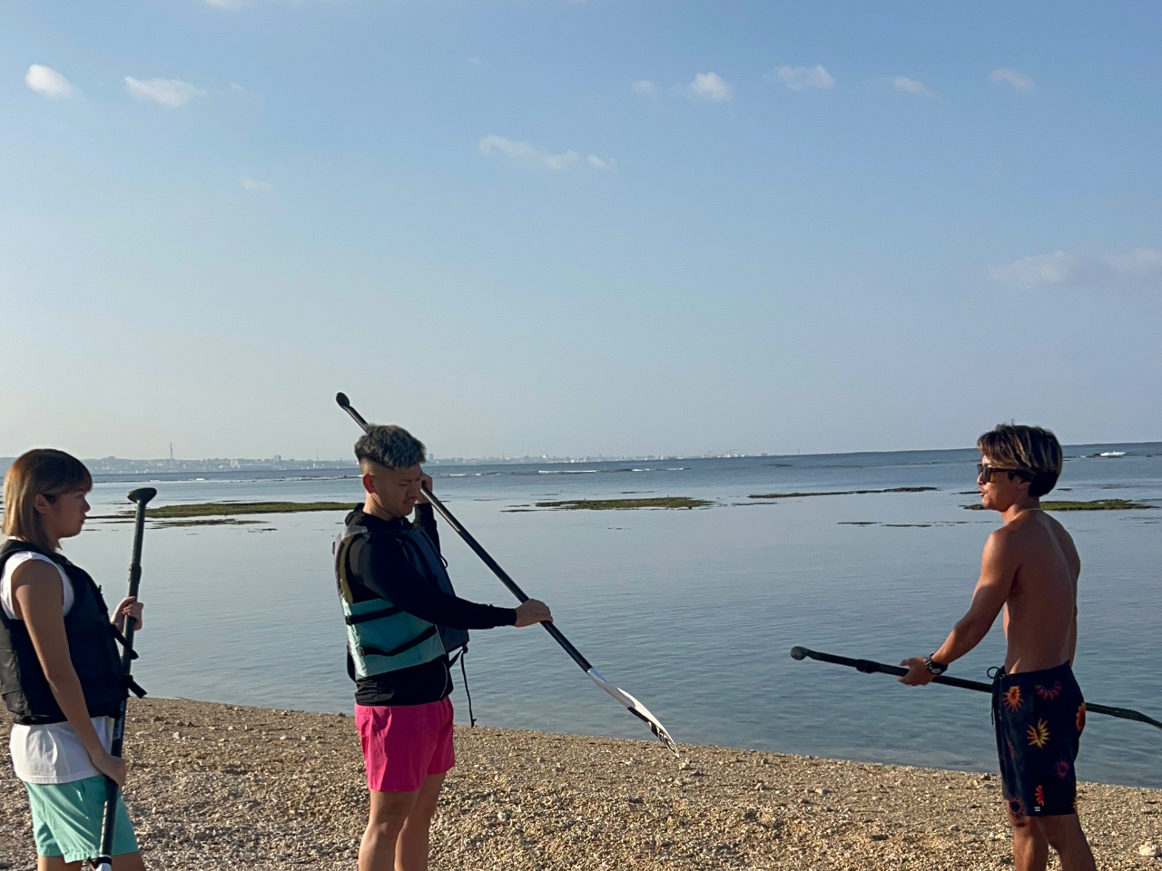 大きく安定感のあるサーフボードの上に立ちパドルを漕いで海上を進むので体力や年齢、経験に関係なく誰でも簡単に楽しめます。海の上を散歩したり、波に乗ったりして初心者でも気軽に楽しめます。透明度の高い沖縄の海では海中の珊瑚や熱帯魚も観察できますよ。
