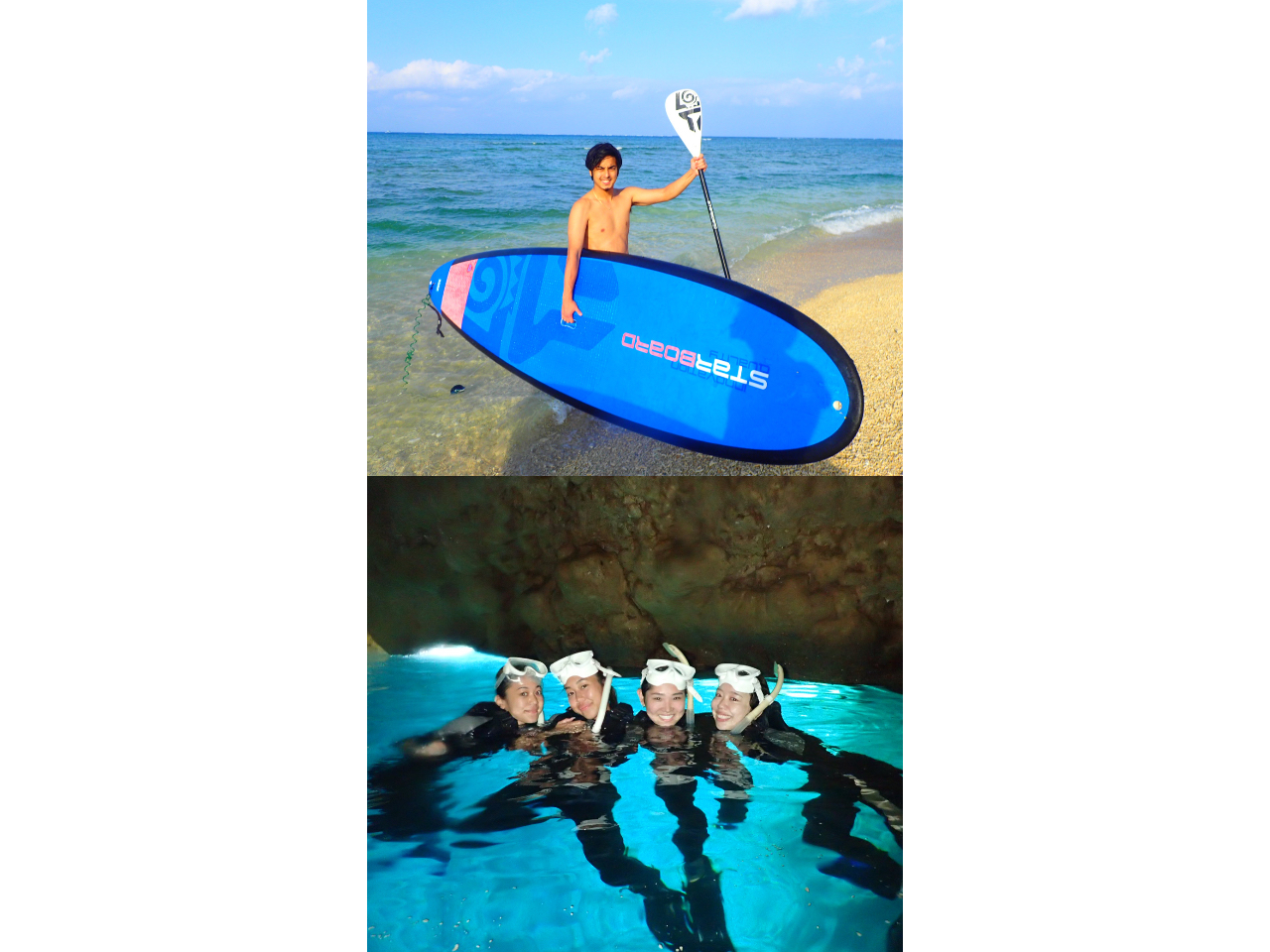 沖縄で人気の青の洞窟シュノーケリングツアーとここ数年、日本でも注目を集めている新感覚マリンスポーツのサップを組み合わせたお得なプランです。