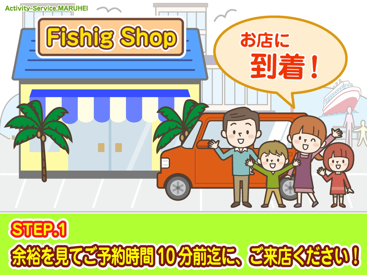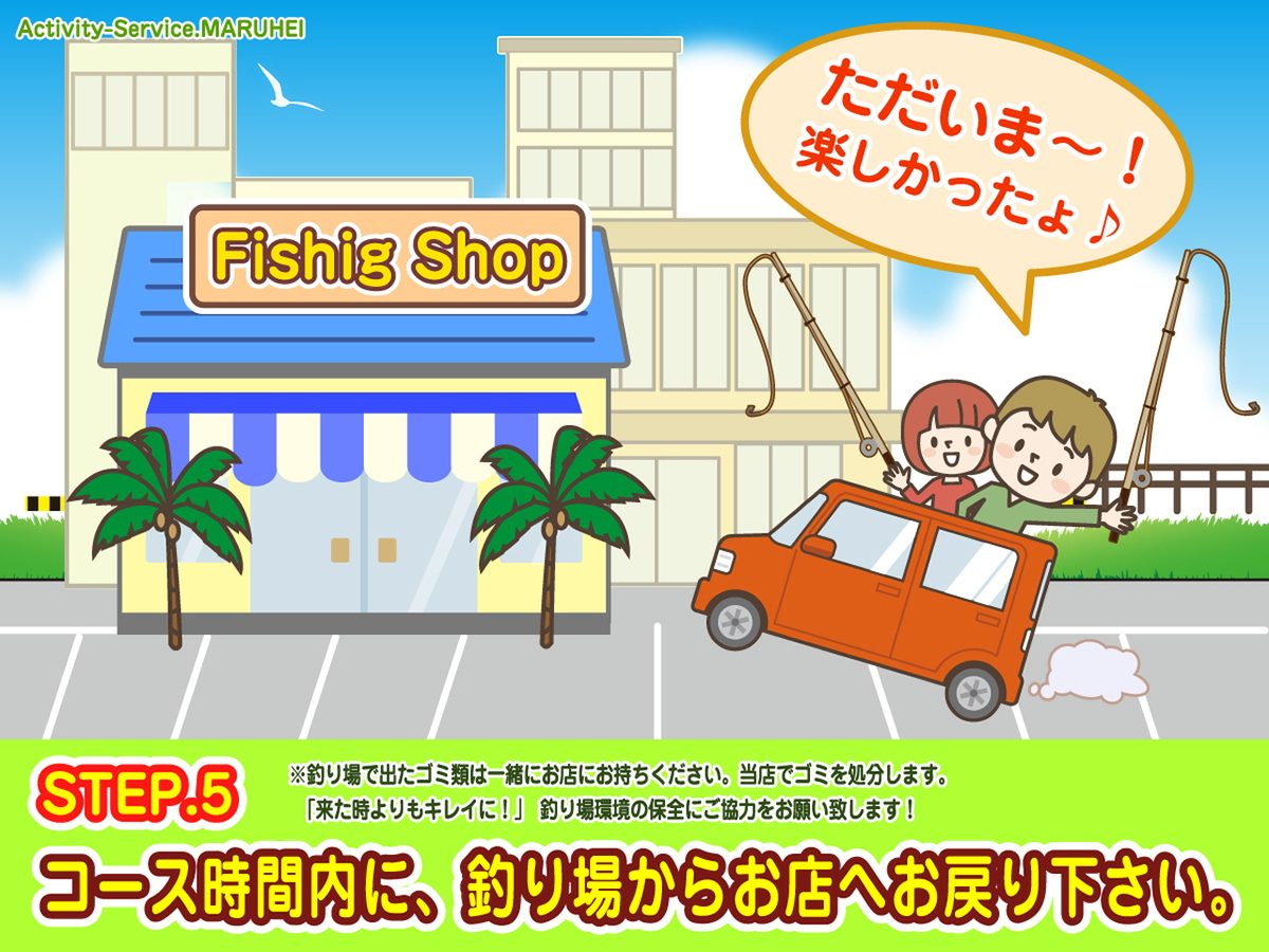 受付時に当店周辺の釣り場を何箇所かご案内致します!お好きな釣り場へご移動いただいてLet's Fishing!お時間のゆるす限り、釣りをお楽しみください♪