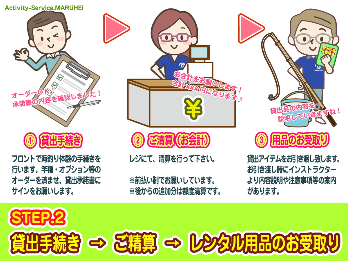 当店にて「釣竿」と「釣りに必要な道具一式(バケツ・釣具・雑巾他)」をレンタル致します