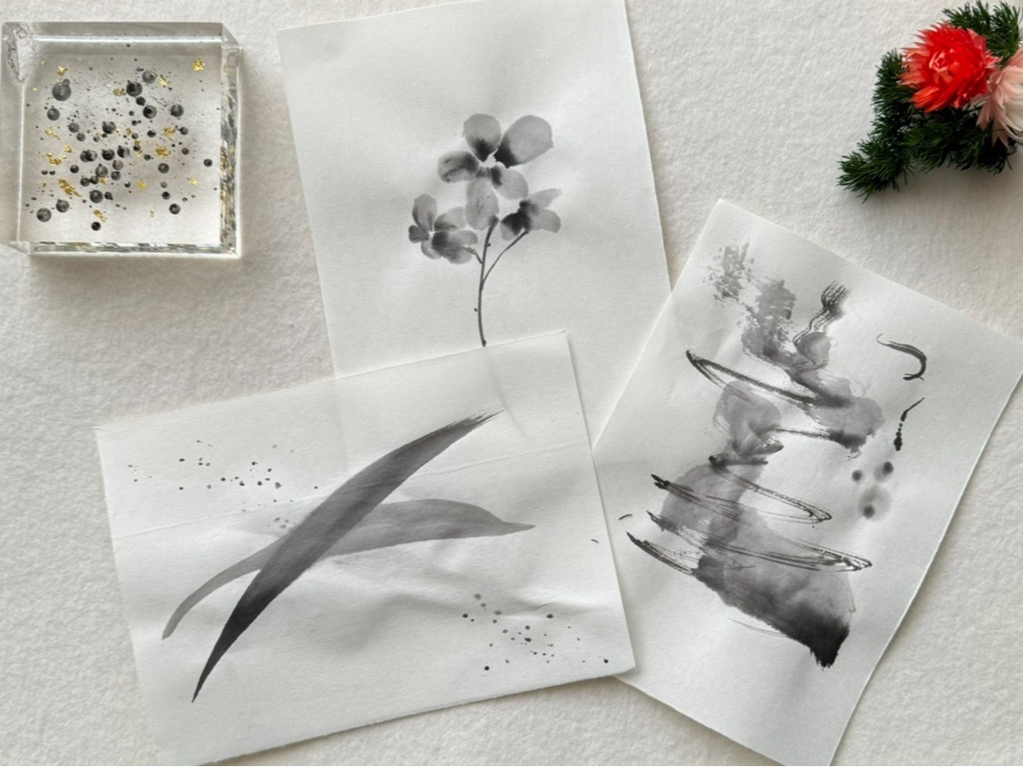 @墨とアロマの心地よい香りでリラックスしながら、墨の面白さを体験するアートワーク