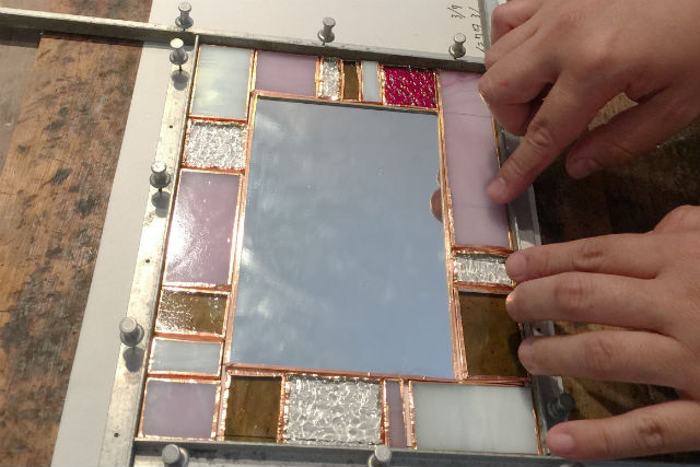選んだガラスに専用のテープをはり、パーツを組み合わせていきます。