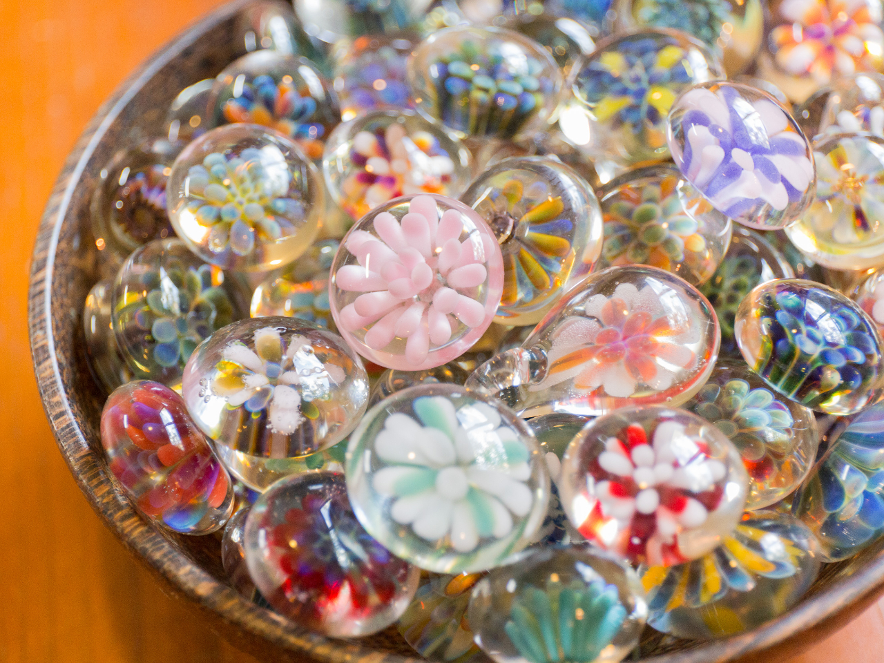 透明な官ガラスや、棒ガラスから、酸素バーナーの炎の中、一つ一つ作り出される作品は、魅惑的な模様と、数百種類の色で二つと同じもののない世界に一つだけのガラスとなります。