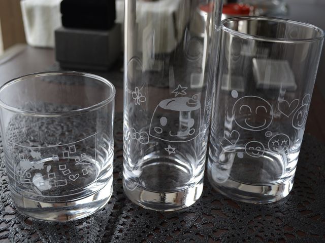 紙にイラストや文字を自由にデザインして、複数のグラスやマグカップから1つ選んだ物に作っていきます。