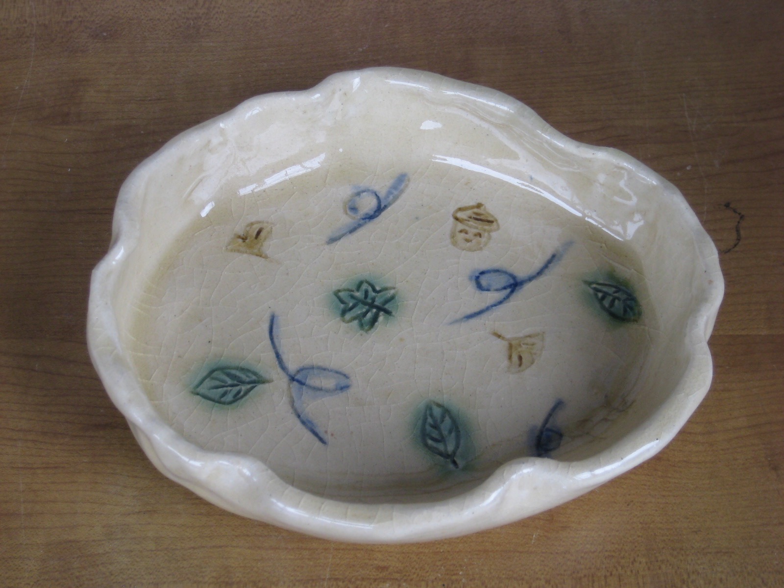 色の薄い釉薬の場合、青、緑、茶、ピンクで模様に色が付けられます。