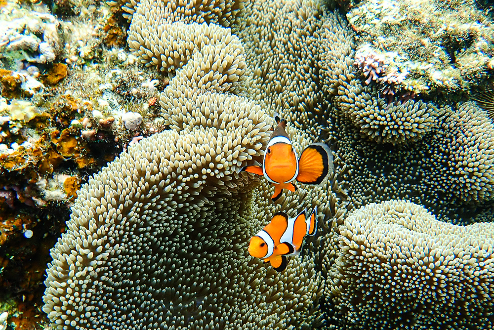 ウェットスーツに着替えた後は、浅瀬でシュノーケルの練習を行います。シュノーケルクリアもここで実際に練習します。シュノーケルに慣れたらサンゴ礁の海へ出発です。たくさんの熱帯魚と色鮮やかなサンゴ礁。心も体も癒される最高のリラクゼーションが得られます。ニモことカクレクマノミやハマクマノミ、そして群れで見られるデバスズメダイに感動間違いなしです。
