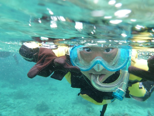小さなお子様もレクチャーをしっかりと行うので安心です。もしできなかった場合は、シュノーケルボートに乗って箱メガネで水中を観察しようね。