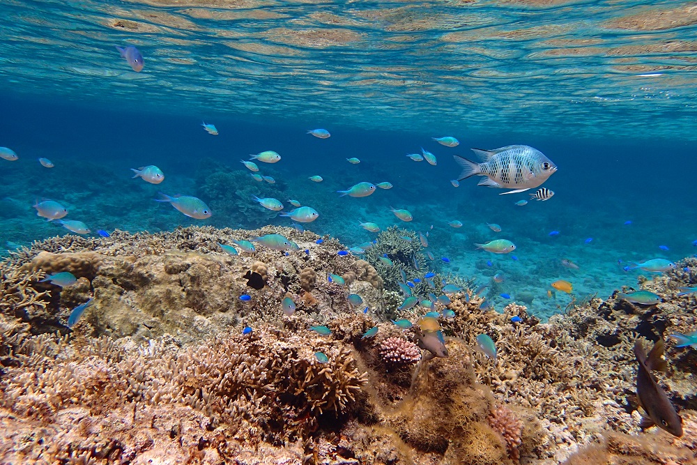 エメラルドグリーンに輝く海は沖合のリーフエッジ(白い波のたつ所)までとても浅くなっています。エントリーしてすぐにサンゴ礁が見られ、色鮮やかな熱帯魚が群れをなして泳いでいます。沖縄の海は微生物やプランクトンなどの小さな生き物たちが少ない為、透き通って海面から底の方まで見渡せるのです。