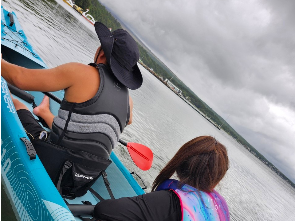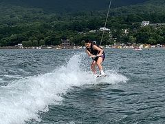 台風の影響で、晴れ間が見えたり土砂降りだったりしましたが、湖は穏やかで、フライボートやウェイクボード体験を楽しみました。インストラクターの的確なご指導で、息子はどちらもすぐにできるようになり、母も悔いの残らないチャレンジができました。いやー楽しかった!