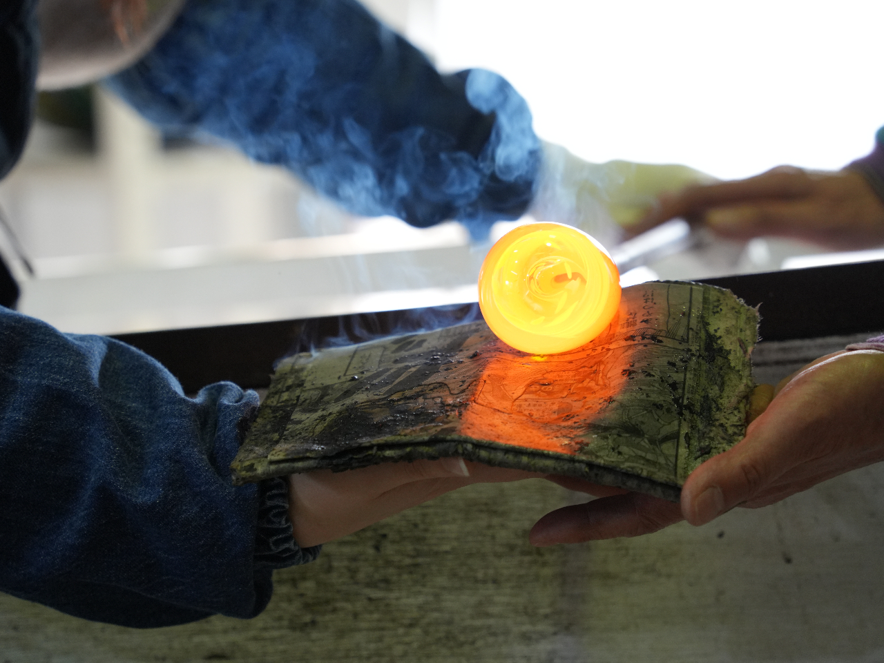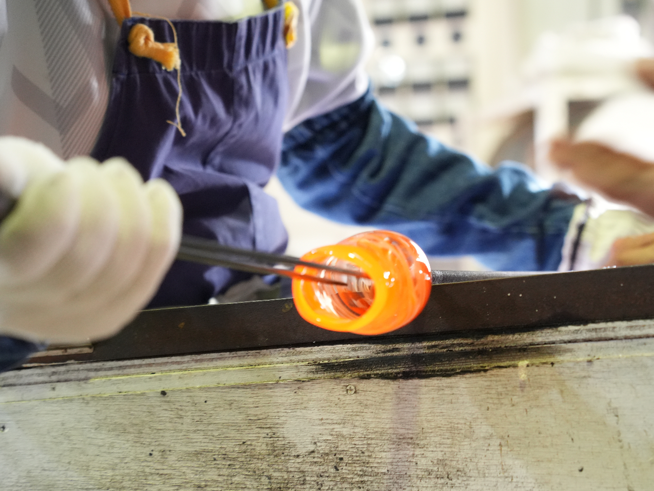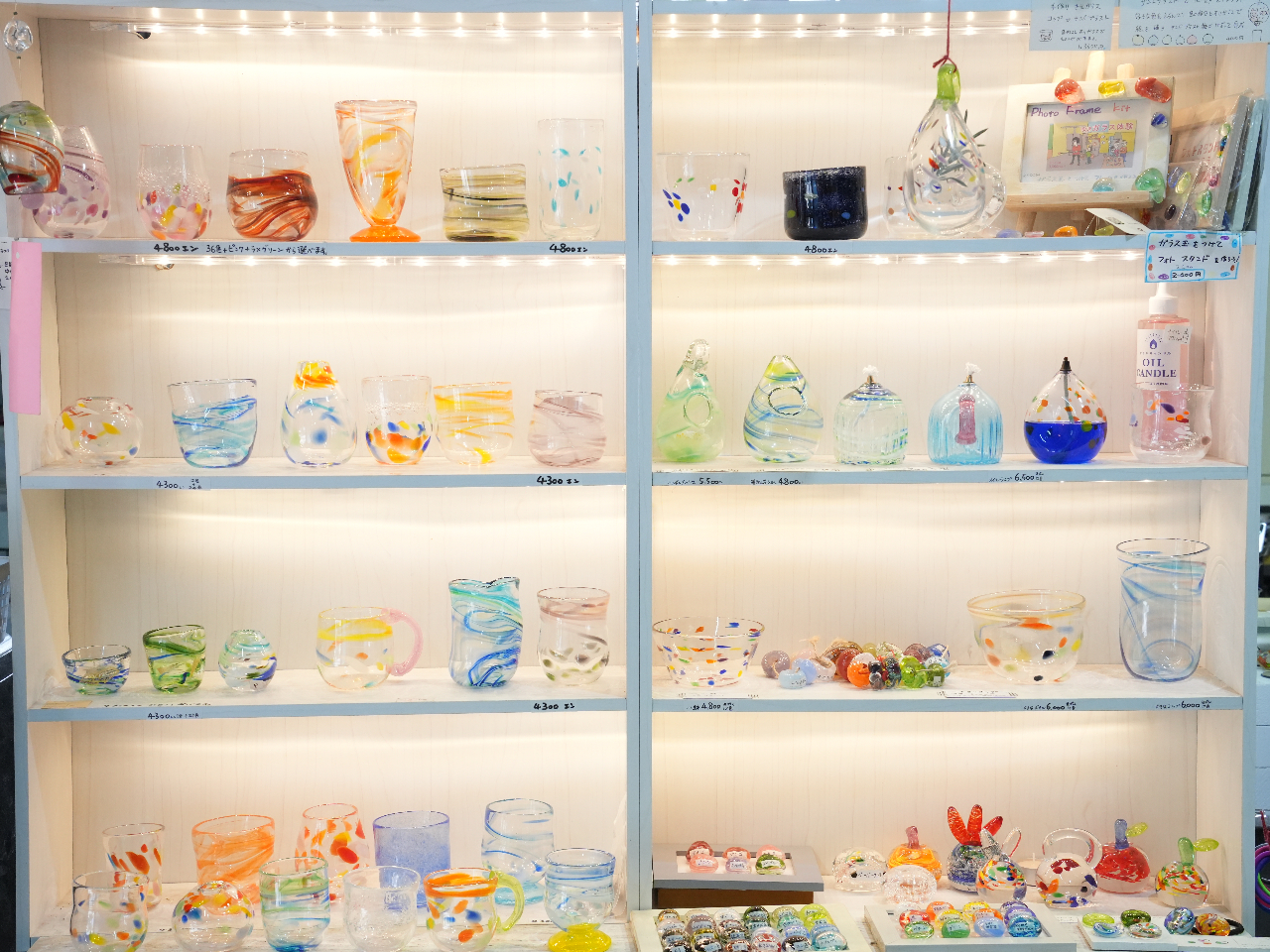 スタジオバクザウルスでは、熱いガラスを竿に巻き取る工程から体験できるレアな体験工房です。たくさんのサンプルをご用意していますので、色や形、模様などお好みのものをお選びいただけます。