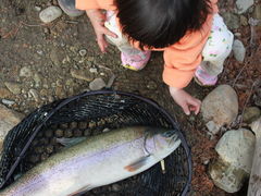 普通の管理釣り場は20CMぐらいのニジマスが釣れますが、那須フィッシングカレッジはジャガートラウトやロックトラウトの大型が連続で釣れるので、通い慣れている娘は大型がかかっても慌てる事無く釣り上げてしまいます。