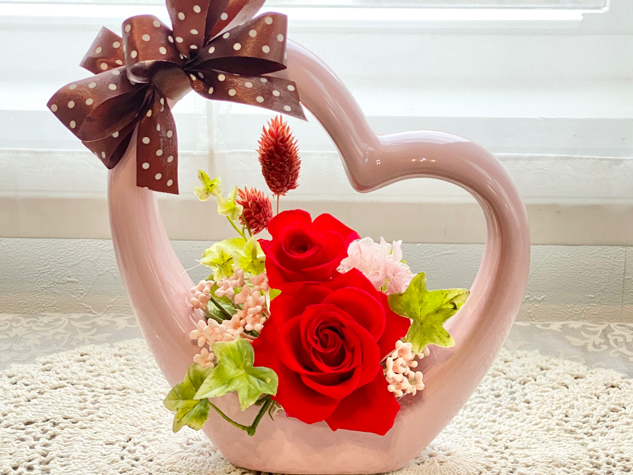ハートの器は白いまたはピンクとなります。在庫のある方でのご提供です。長く思い出と共に咲き続けてくれるプリザーブドフラワーです