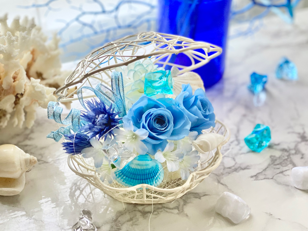 シェル(貝)の器にお花を咲かせましょう☆プリザーブドフラワーならばずっと飾っておけます。水やりもなく手間いらずのフラワーインテリアを作っていただけます。花色は自分らしいお好きな色で!