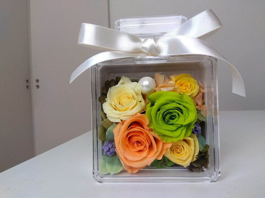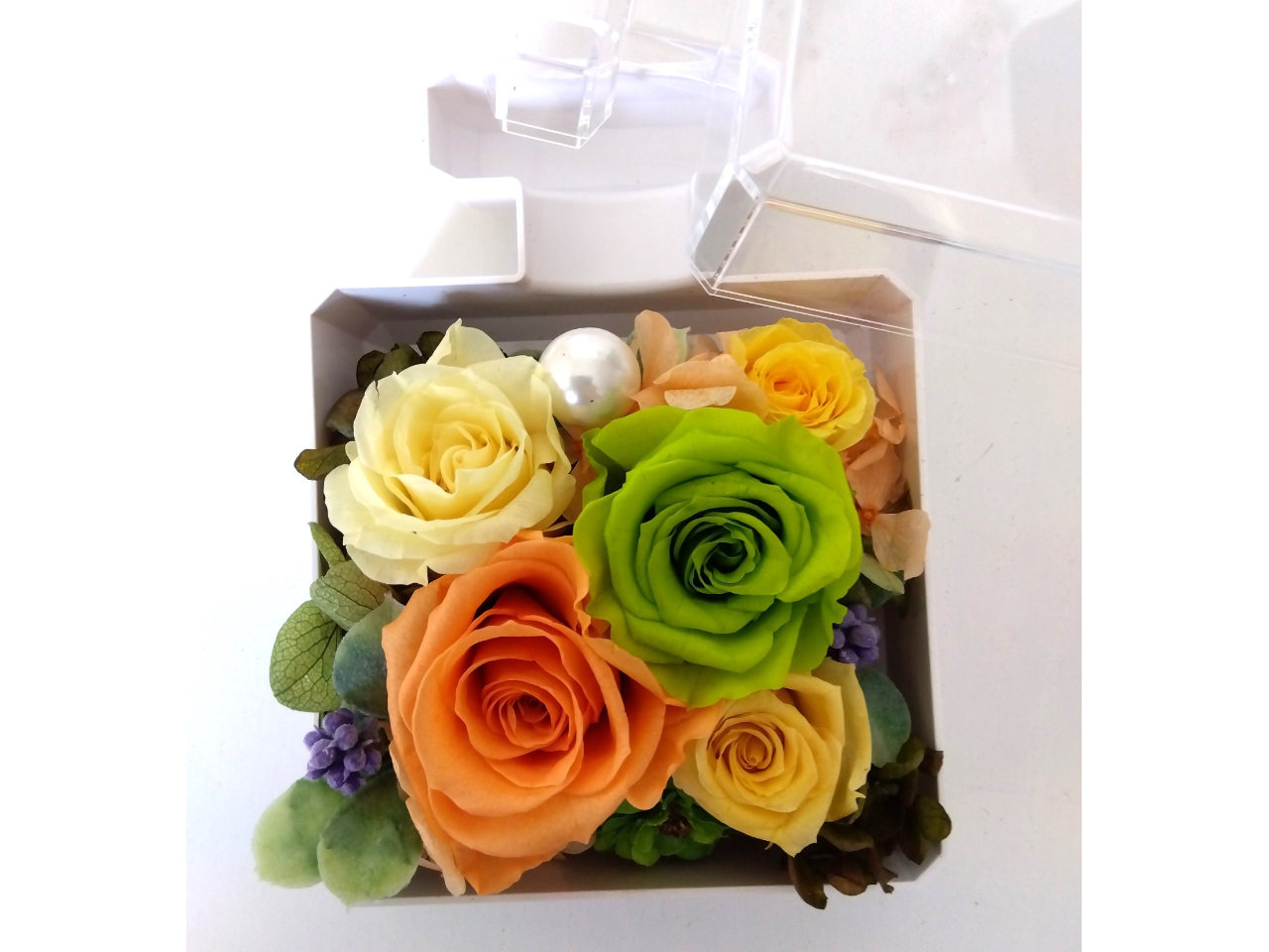 オレンジ、グリーン、イエローのプリザーブドフラワーのバラをメインにカラフルなアレンジですフラワーアレンジメント・ガーデニング