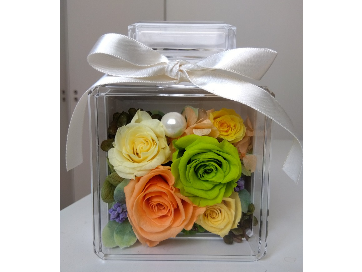 オレンジ、グリーン、イエローのプリザーブドフラワーのバラをメインにカラフルなアレンジです