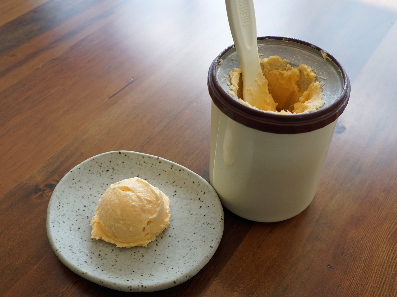 A冷えた専用容器に入れてスプーンでかき混ぜると、フレッシュアイスクリームのできあがり!!