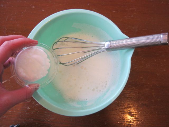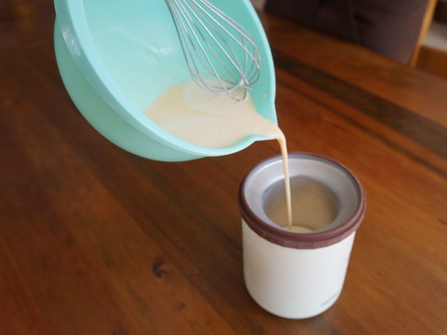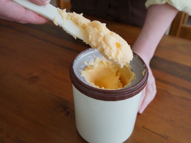 A冷えた専用容器に入れてスプーンでかき混ぜると、フレッシュアイスクリームのできあがり!!
