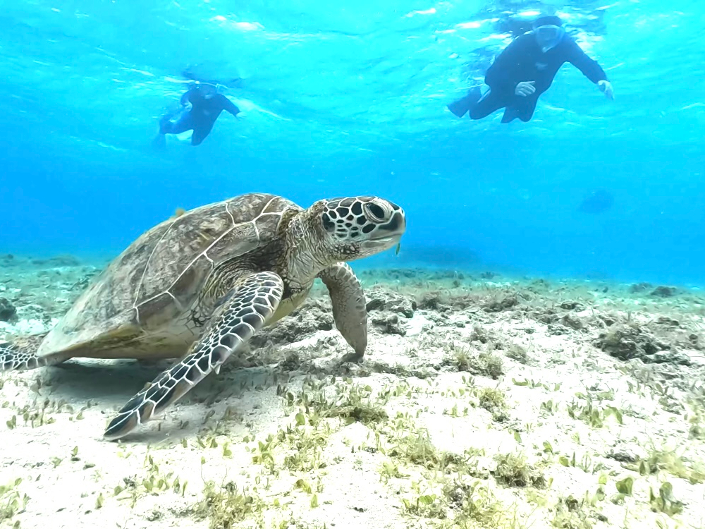 ウミガメとの遭遇率は99%です。足のつく浅いところからスタートします。スタッフが器材の使い方やお魚の解説など、詳しくご案内しますので未経験の方でもご参加いただけます!