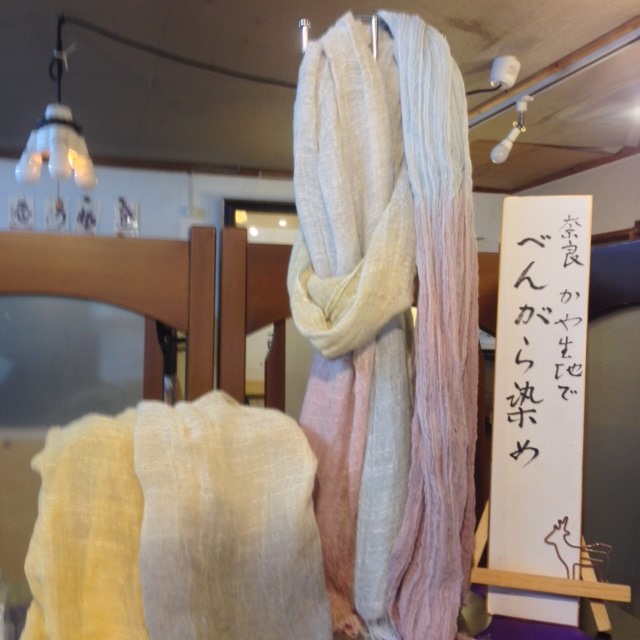 【べんがら染め体験】天然の染料で染めるのでお肌に優しい♪ストールまたはハンカチが作れます。「元興寺」より徒歩2分。ファミリー・カップルおススメ ■奈良特産のかや生地で作った、ストール、ハンカチの染物です。