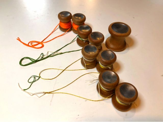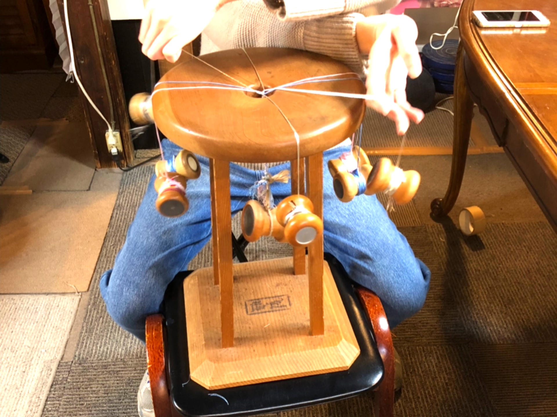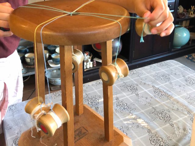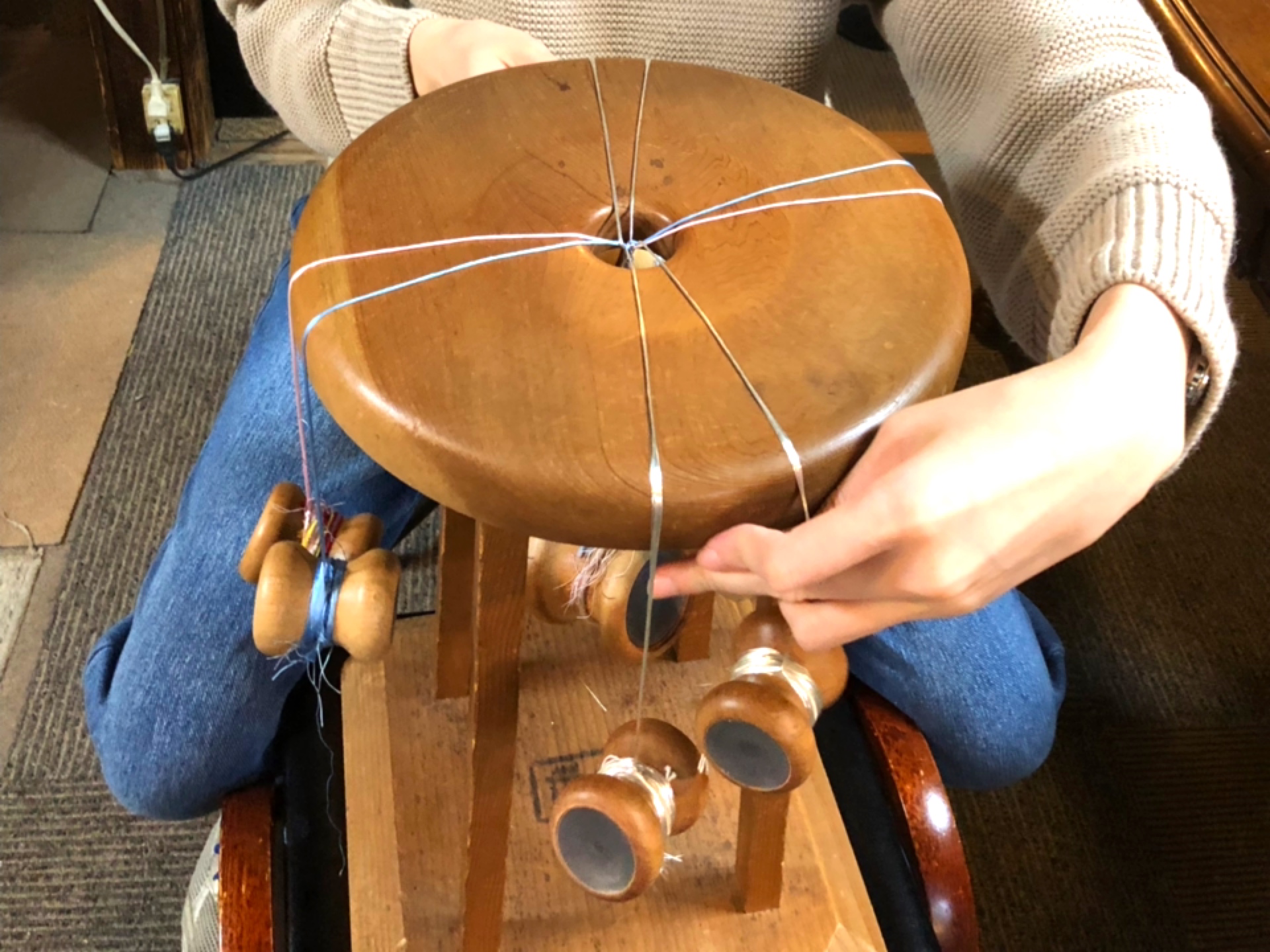 2.丸台に糸をかけて、お好みの長さまで組んでいただきます。