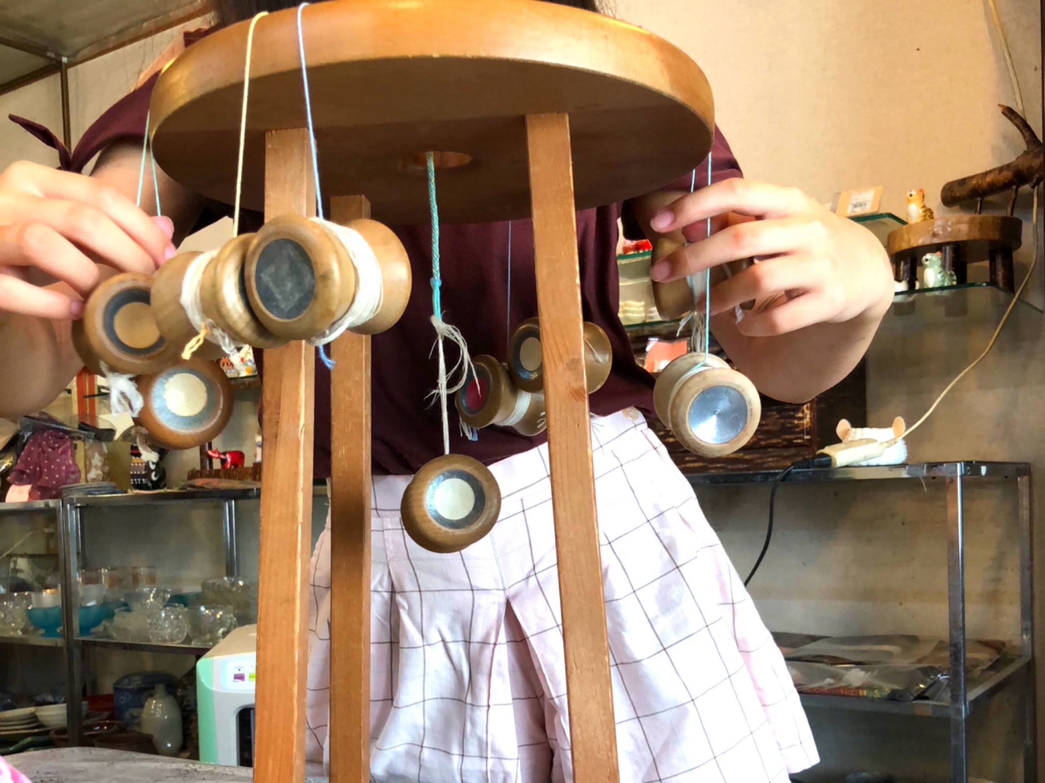 2.丸台に糸をかけて、お好みの長さまで組んでいただきます。