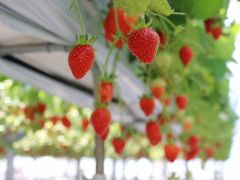 立ったままいちご狩りができるハウスでは少し下から撮影するといちごがきれいに撮れます