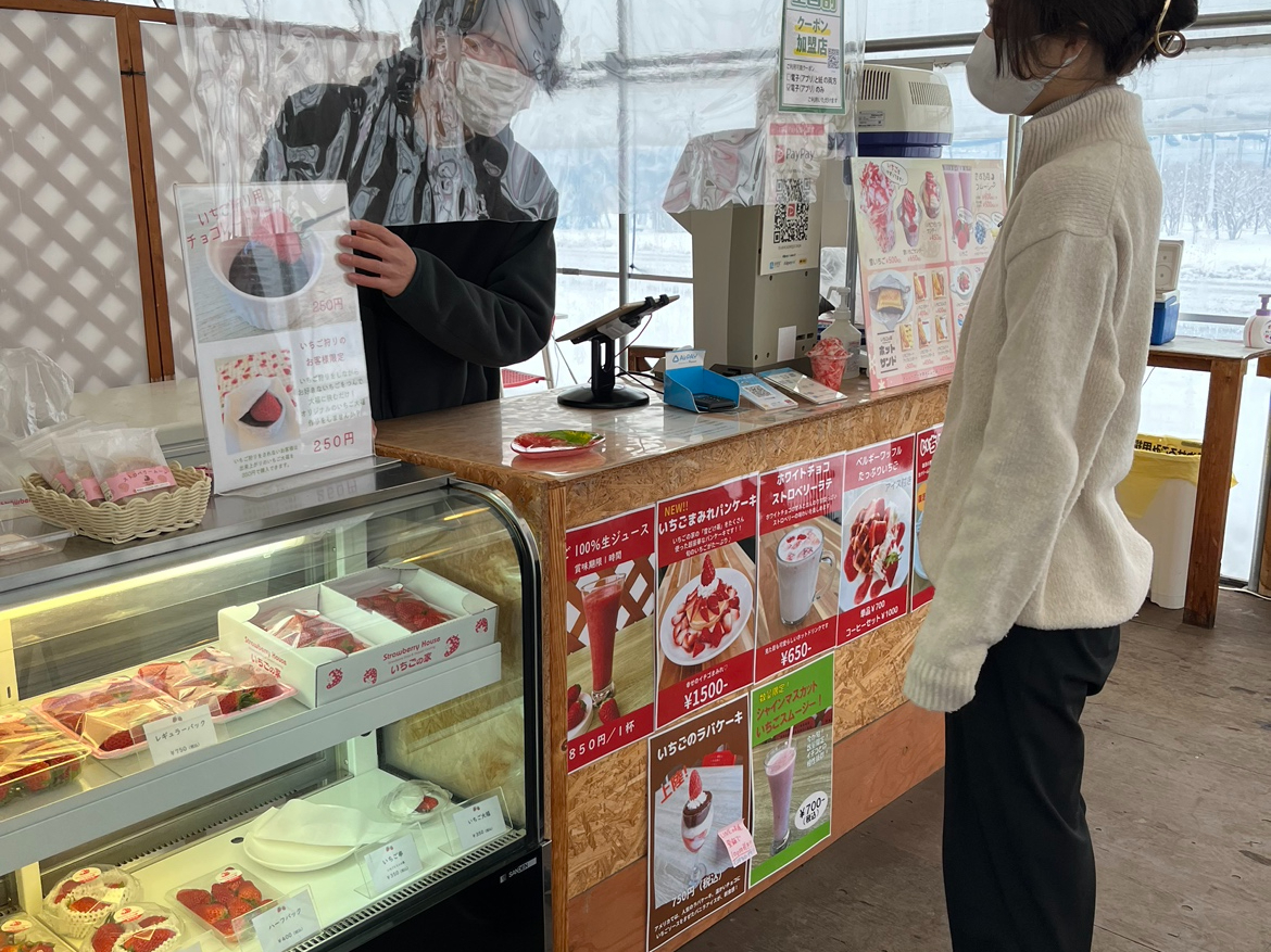 施設内で採れた新鮮な雪どけいちごのパック詰めを直売している他、 いちごの家のいちごを使ったドーナツなどお土産品の販売も行っております♪